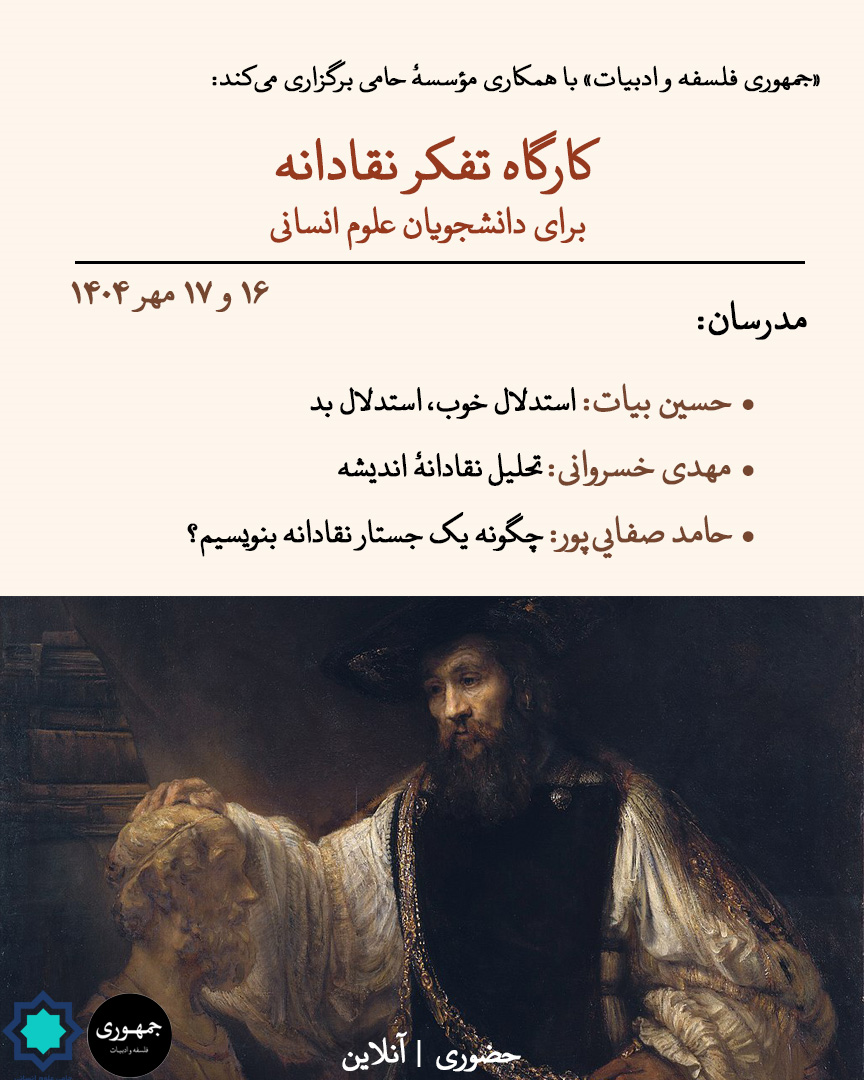 «جمهوری فلسفه و ادبیات» در نظر دارد، با حمایت مؤسسهٔ «حامی علوم انسانی» یک دورۀ کوتاه کاربردی «تفکر نقادانه» را با همکاری سه تن از مدرسان و مترجمان شناختهشدۀ این حوزه برگزار کند. در این دوره، سه مهارت کلیدی تفکر نقادانه در قالب کارگاهی دوازدهساعته به شرکتکنندگان آموزش داده میشود.